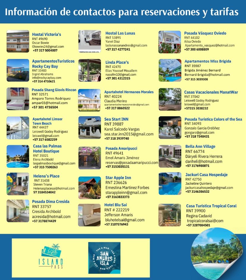 Para reservaciones y disponibilidad deben contactar directamente al alojamiento que prefieran tenemos para todos los gustos y presupuestos en diferentes lugares de la Isla. en el listado a continuación están los correos electrónicos, números telefónicos de 21 alojamientos de los 45 establecimientos afiliados a nuestra Asociacion, Las tarifas publicadas son netas y están sujetas a cambios por parte de los anfitriones de acuerdo a la disponibilidad y temporadas en baja se realizan promociones y pueden bajar, en temporada media pueden también estar sujetas a descuentos por grupos y eventos y las publicadasaplican siempre en alta temporada.